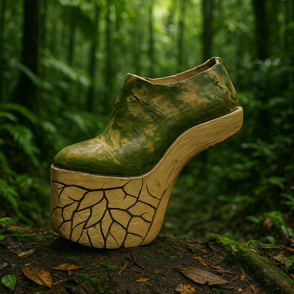 The shoes are conceptually driven by the contrast between the structured, snow-covered landscapes of the Austrian Alps and the organic forms of the Amazon. The white surfaces evoke snow enveloping the upper, creating an analogy to alpine mountains, while the irregular wooden platforms are inspired by the natural structures and fluidity of the Amazon.