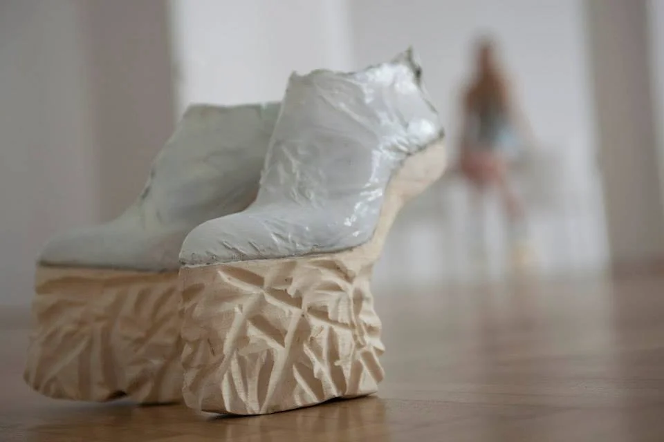 In addition, I worked with lightweight pine wood, which I shaped and crafted by hand to create soles and platforms. This carpentry process was an essential part of the project, driven by the intention to incorporate biodegradable materials. The collection maintains an avant-garde and innovative style while exploring the intersection of traditional craftsmanship and sustainable design.